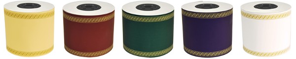 Disponemos de ribbon de distintos colores: verde, rojo, morado, azul, negro y opciones de acabado metálico, con impresiones en oro o plata. Llámenos y le asesoraremos para que pueda realizar sus propias impresiones de las contas de las coronas funerarias y las cintas de ramos para novias.
